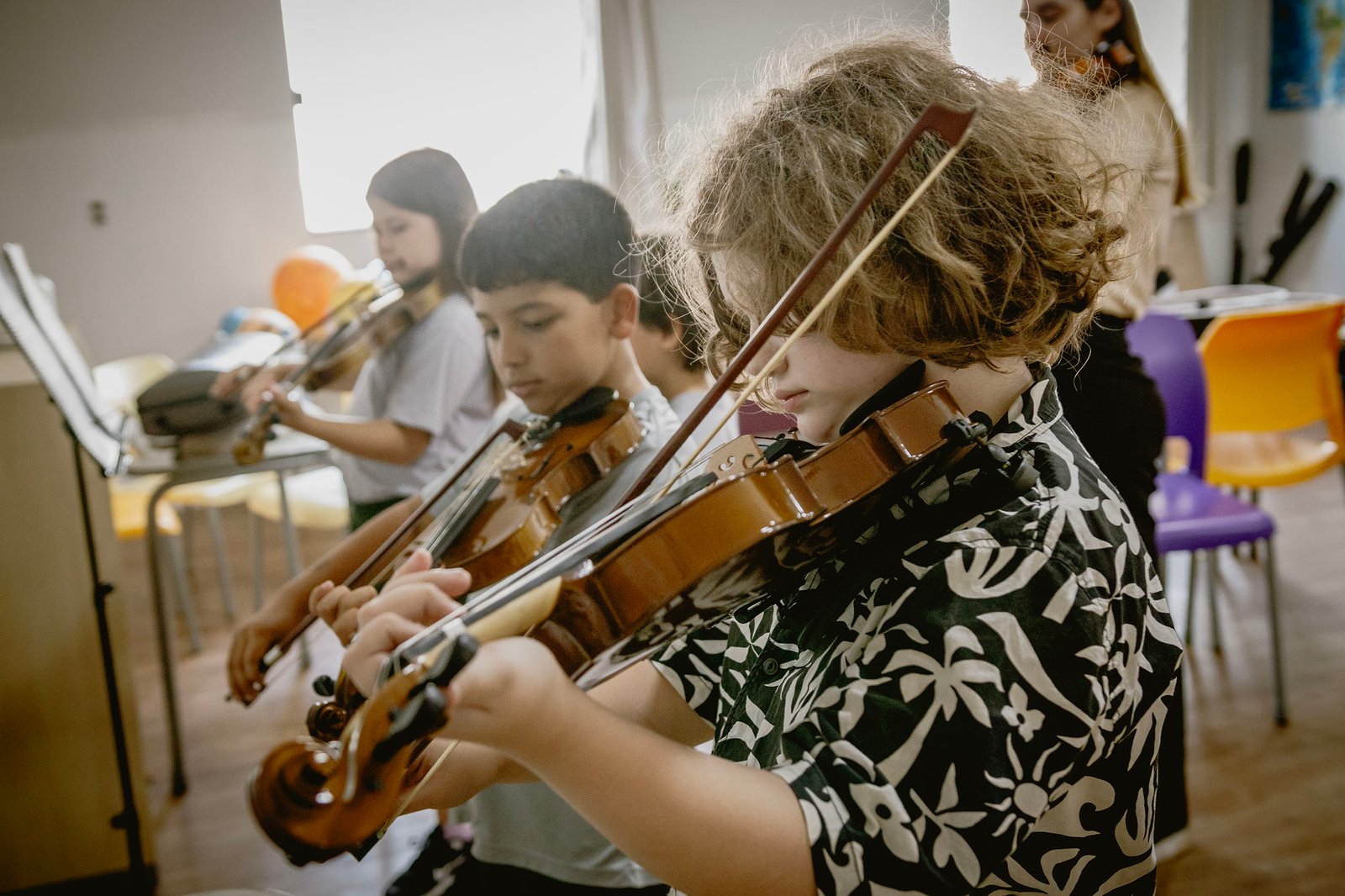• Os estudantes são apresentados aos diferentes elementos da música, como ritmo, melodia e harmonia, despertando seu interesse desde cedo.
